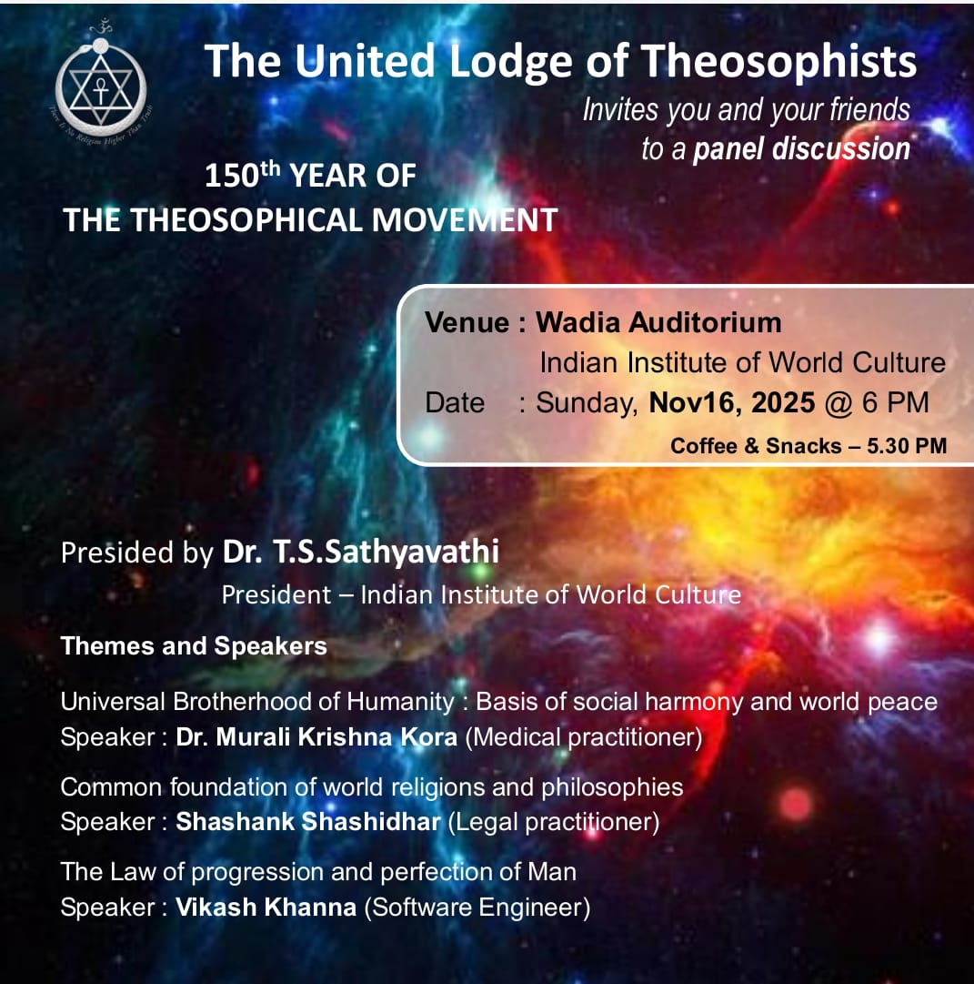 Wadia Hall The Indian Institute of World Culture, #6, Shri B P Wadia Road,, Bangalore, Karnataka, IndiaPanel discussion (On the occasion of 150th Anniversary of the Theosophical Movement)