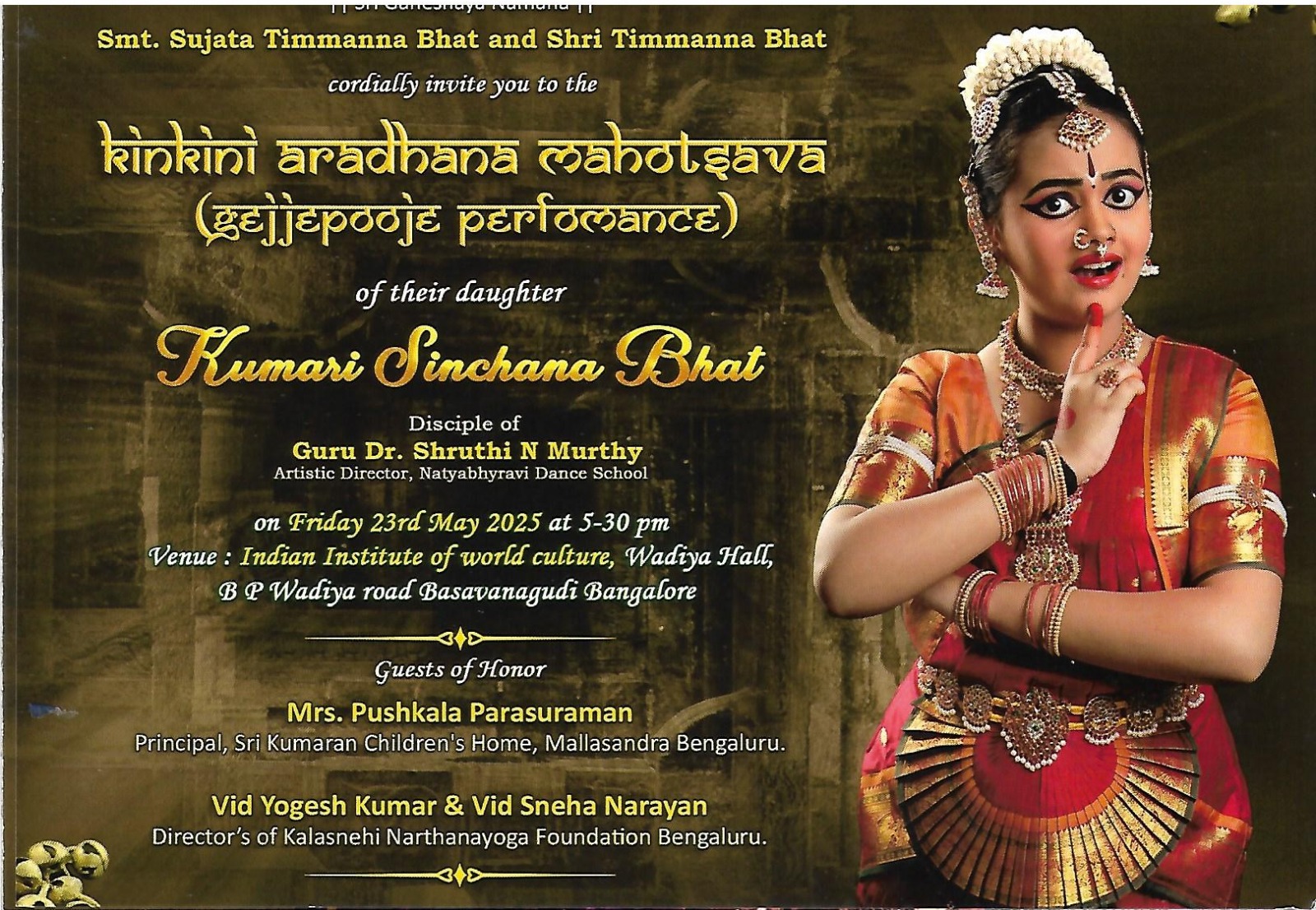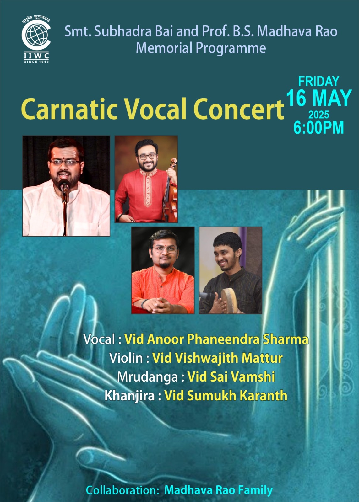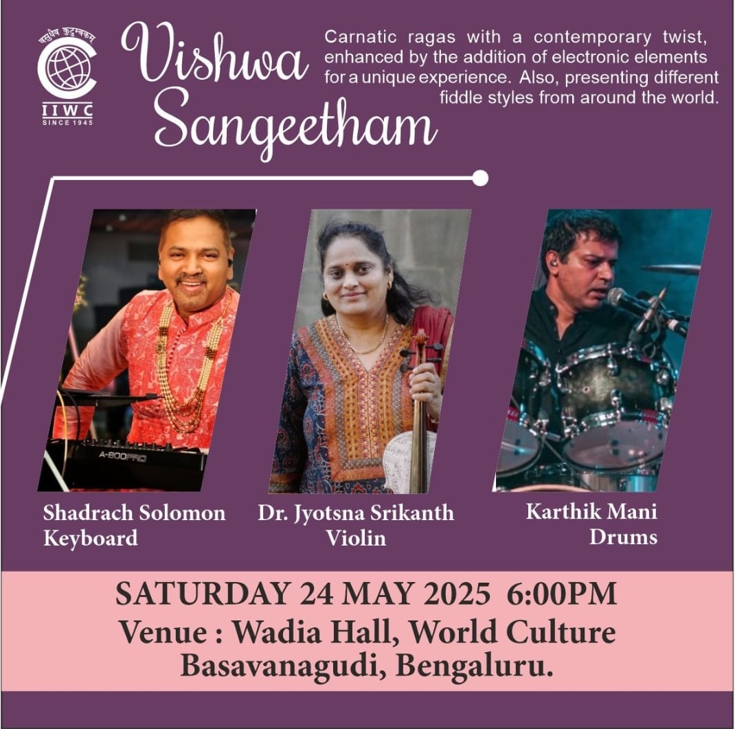 Wadia Hall The Indian Institute of World Culture, #6, Shri B P Wadia Road,, Bangalore, Karnataka, IndiaSri D. C. Reddappa Setty and Smt. D. C. Kamakshamma Memorial Program Carnatic Vocal Concert Vocal : Vidwan Vinay Sharva Violin : Vidwan Raghu B K Mridangam : Vidwan Anoor Vinod Shyam Konnakkol : Vidwan Somashekar Jois Collaboration : Shri D. Venkatesh Gupta