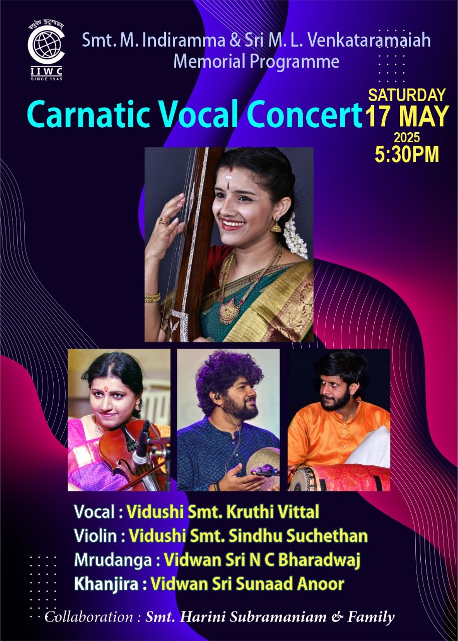 Smt. M. Indiramma & Sri M. L. Venkataramaiah Memorial Programme Carnatic Vocal Concert Vocal : Vidushi Smt. Kruthi Vittal Violin : Vidushi Smt. Sindhu Suchethan Mridangam : Vidwan Sri N C Bharadwaj Kanjira : Vidwan Sri Sunaad Anoor