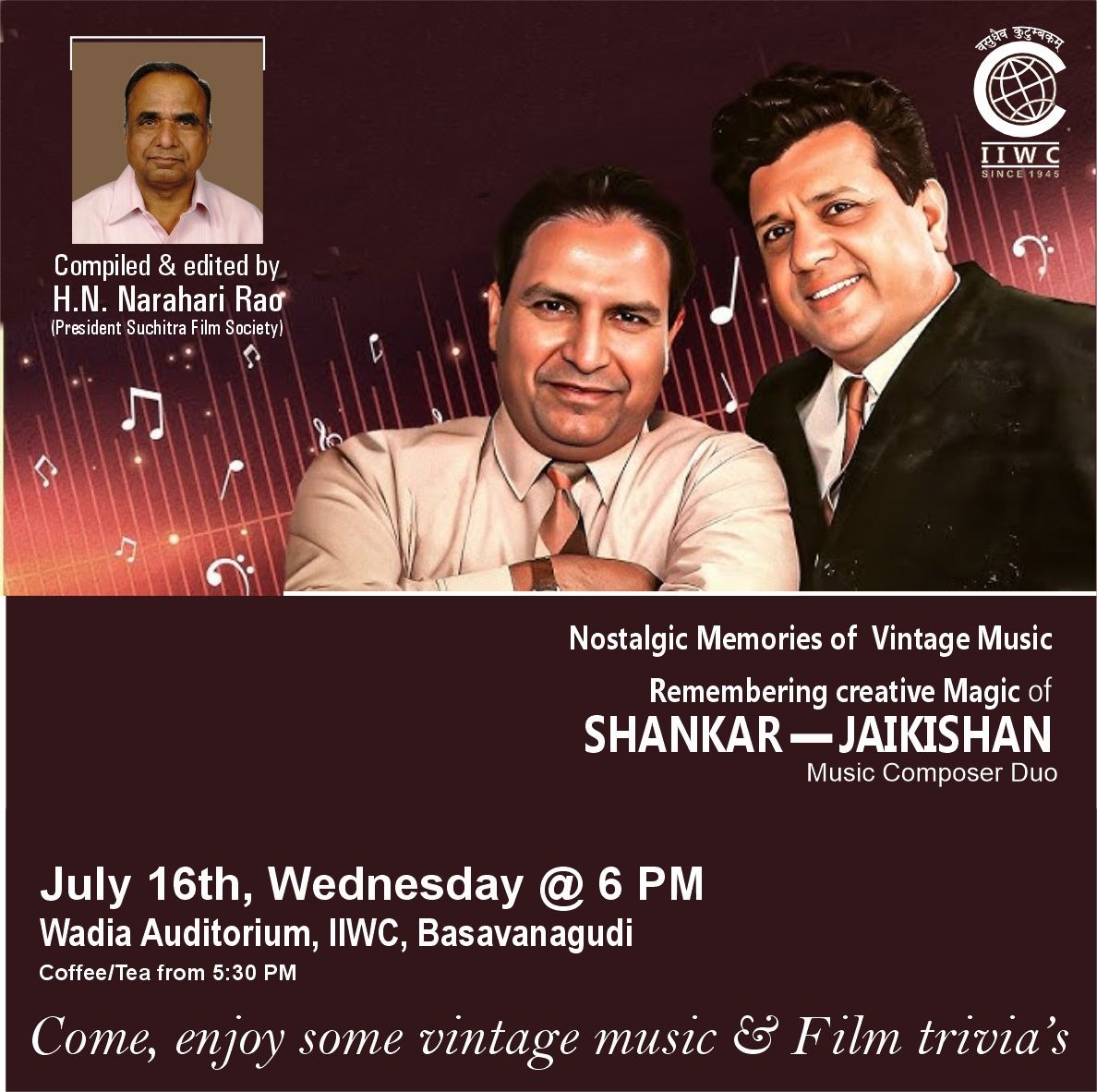 Wadia Hall The Indian Institute of World Culture, #6, Shri B P Wadia Road,, Bangalore, Karnataka, IndiaTopic : Remembering Shankar Jaikishan Speaker : Sri Narahari Rao (President, Suchitra Film Society)
