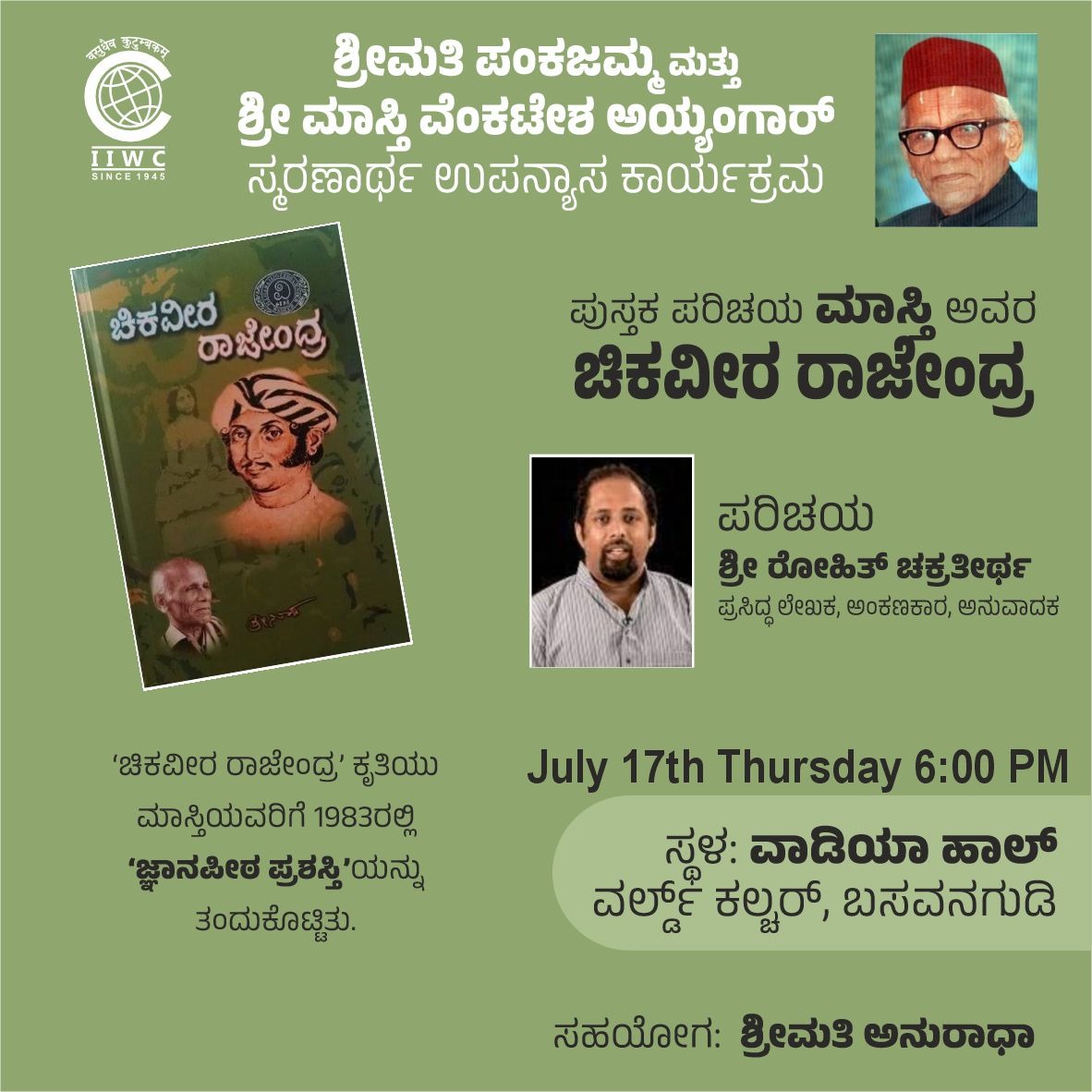 Wadia Hall The Indian Institute of World Culture, #6, Shri B P Wadia Road,, Bangalore, Karnataka, Indiaಪುಸ್ತಕ ಪರಿಚಯ ಮಾಸ್ತಿ ವೆಂಕಟೇಶ ಅಯ್ಯಂಗಾರ್ ರವರ "ಚಿಕ್ಕವೀರ ರಾಜೇಂದ್ರ" ಪರಿಚಯ : ಶ್ರೀ ರೊಹಿತ್ ಚಕ್ರತೀರ್ಥರವರಿಂದ