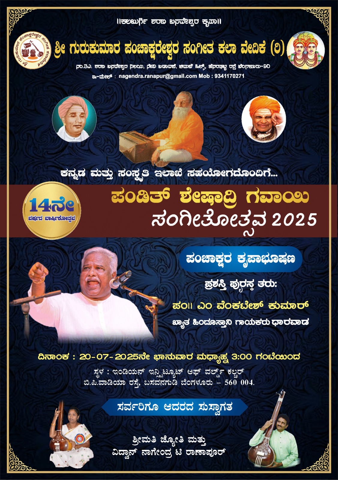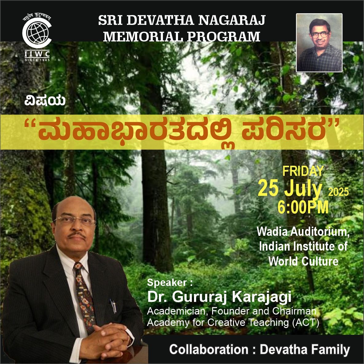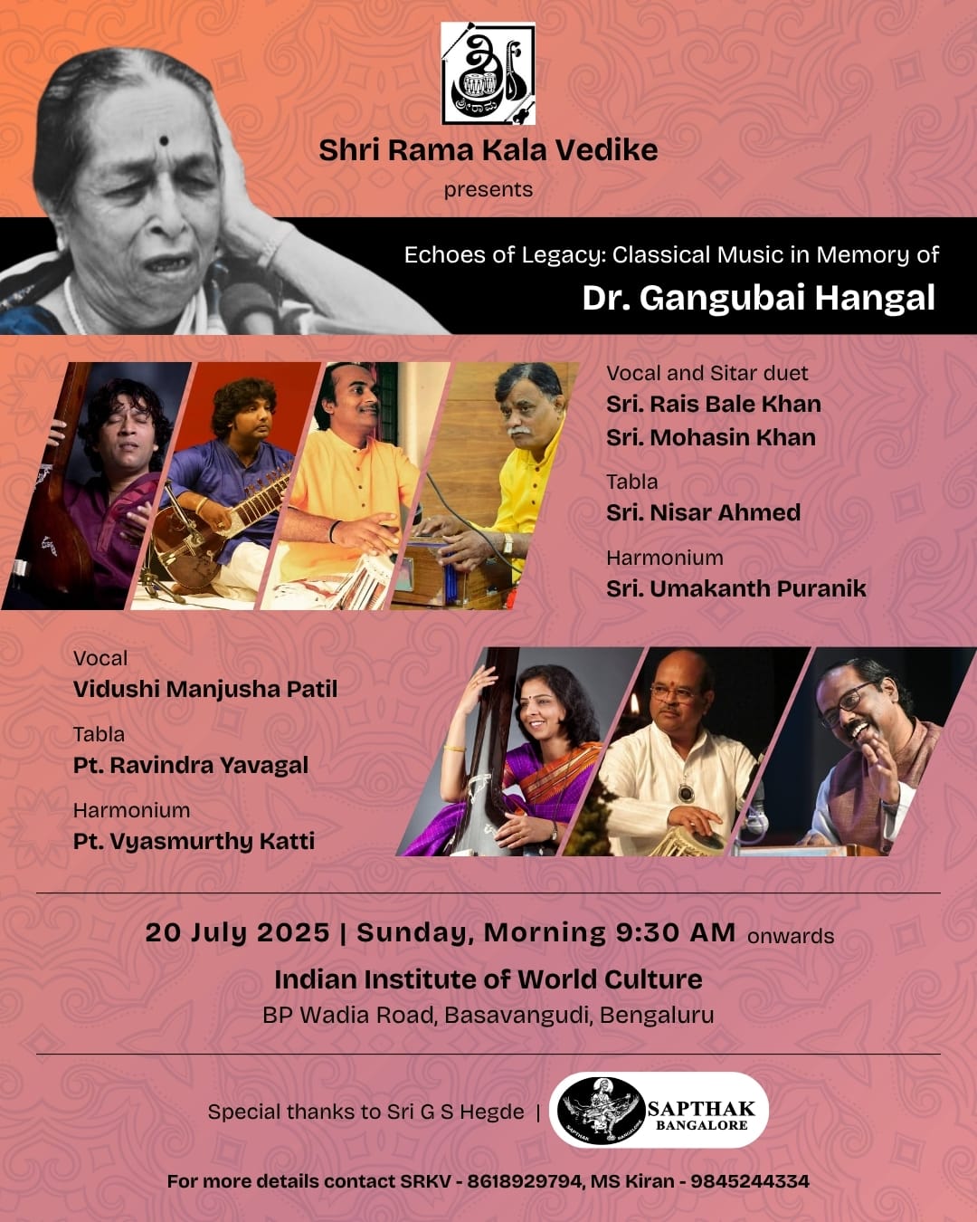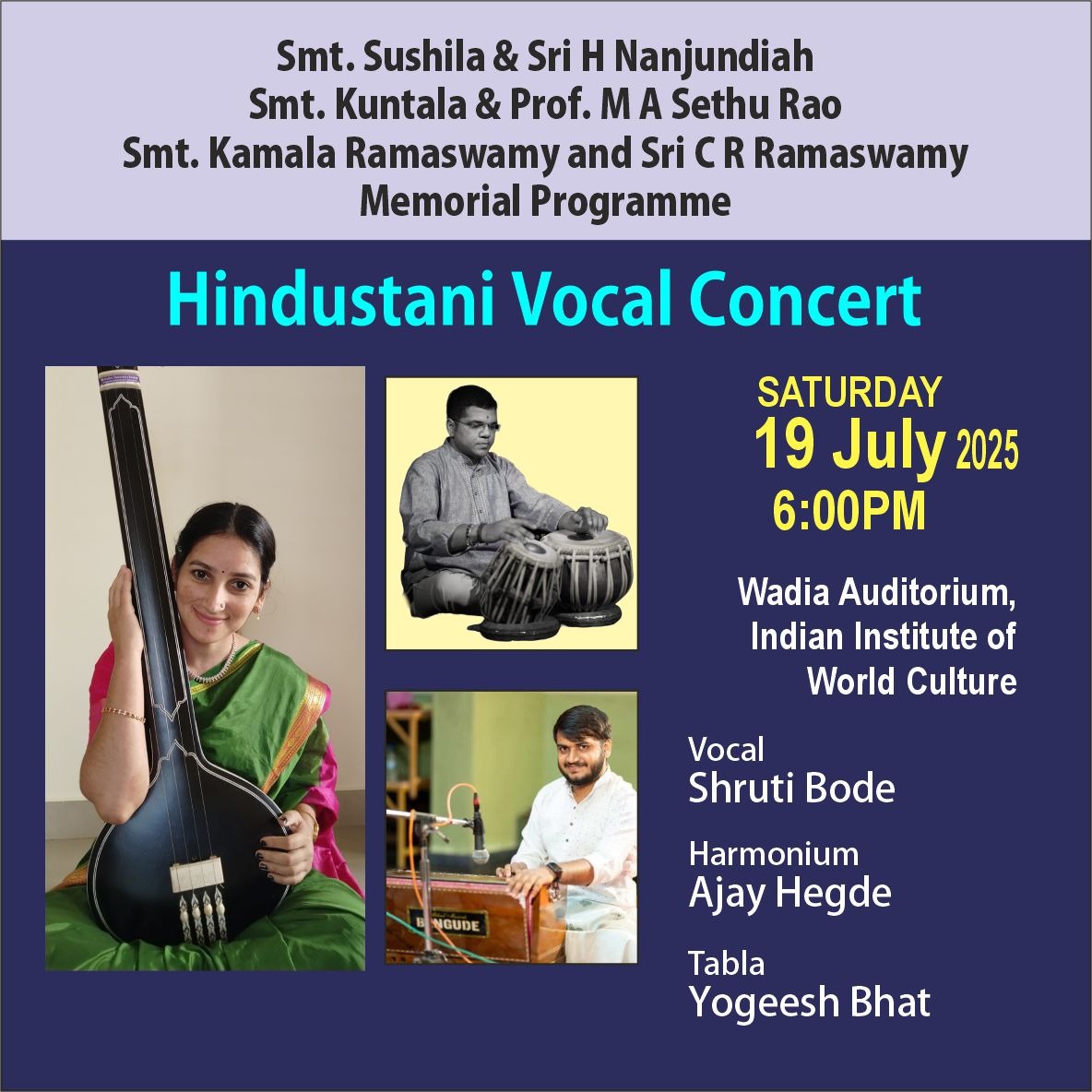 Wadia Hall The Indian Institute of World Culture, #6, Shri B P Wadia Road,, Bangalore, Karnataka, IndiaSmt. Sushila & Sri H Nanjundiah, Smt. Kuntala & Prof. M A Sethu Rao and Smt. Kamala Ramaswamy and Sri C R Ramaswamy Memorial Programme Hindustani Vocal Concert Vocal : Smt. Shruti Bode Harmonium : Sri Ajay Hegde Tabla : Sri Yogeesh Bhat